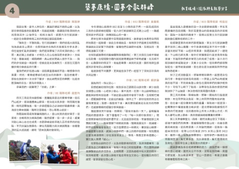 那彷彿奇蹟般的壯麗風景。而談起挑戰,最讓我印象深刻的大 三夜的合歡群峰初體驗,從六次行前訓練到正式踏上山徑,一路感 聞康橋的百岳挑戰,對於喜愛登山的我來說真的非常期